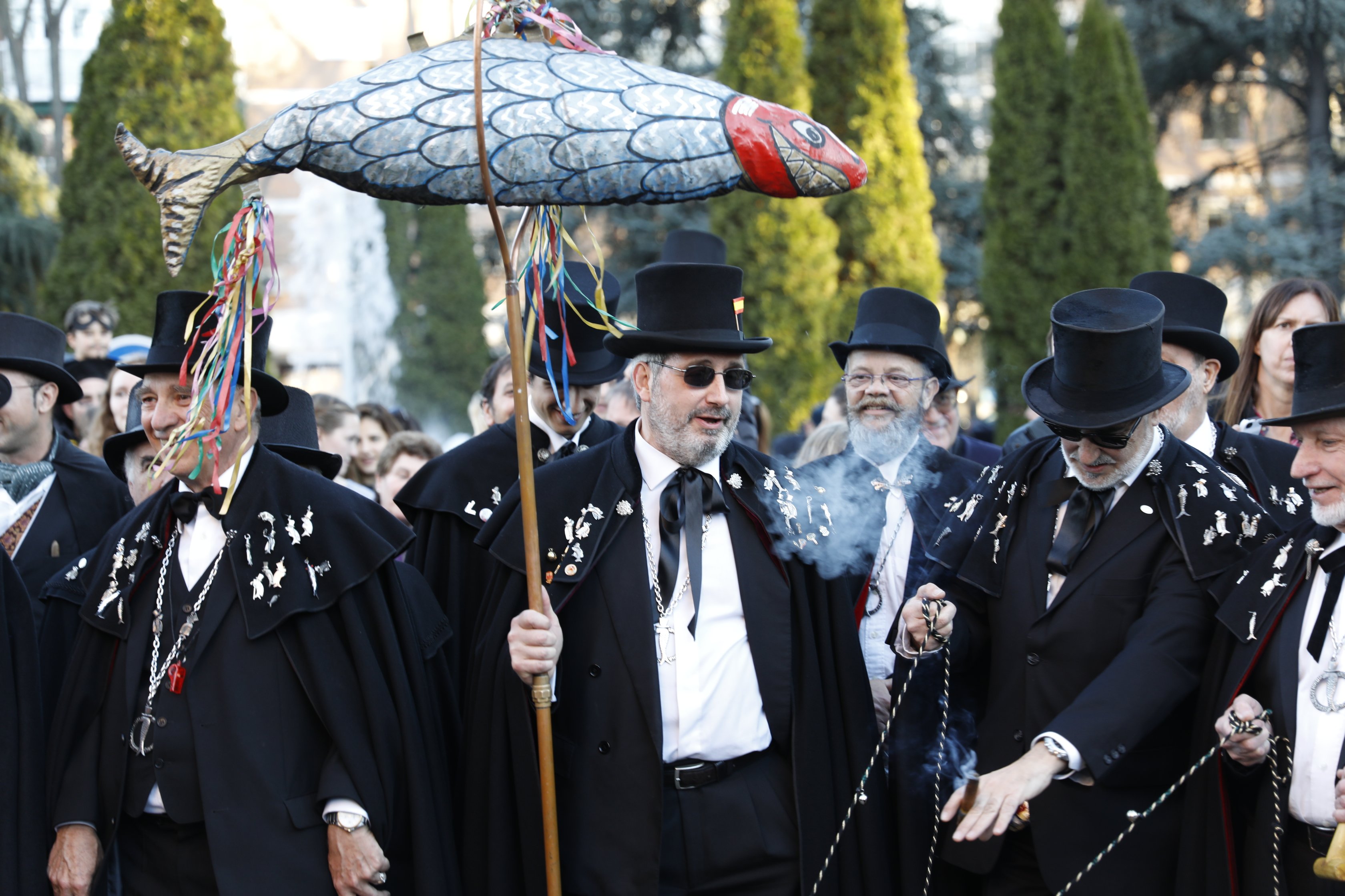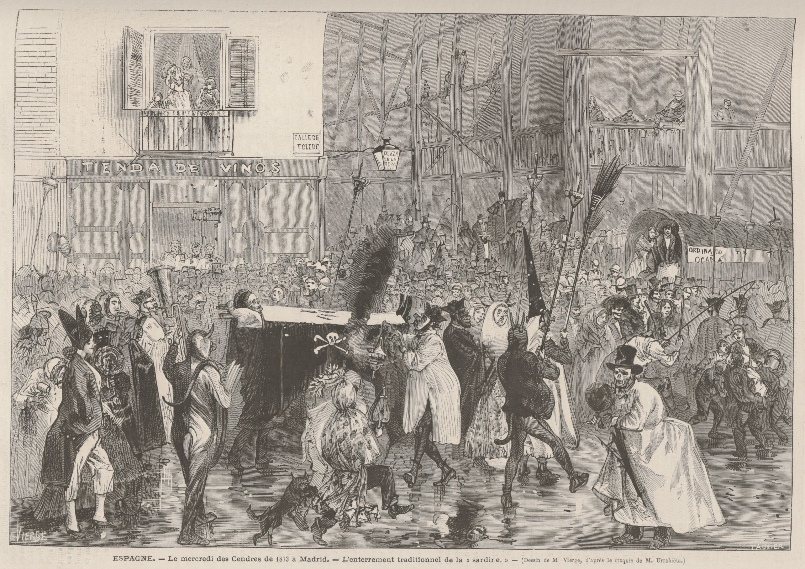 La celebración del Entierro de la Sardina en Madrid se celebra el día exacto del Miércoles de Ceniza y su origen se remonta al menos al siglo XIX, al célebre episodio de las sardinas de Carlos III11. Tras perder relevancia con el tiempo, hoy en día, la tradición, ya recuperada en el calendario festivo de la ciudad, es mantenida y organizada por la Alegre Cofradía del Entierro de la Sardina12, que se encarga de realizar el cortejo fúnebre y la quema en la Dehesa de la Villa.