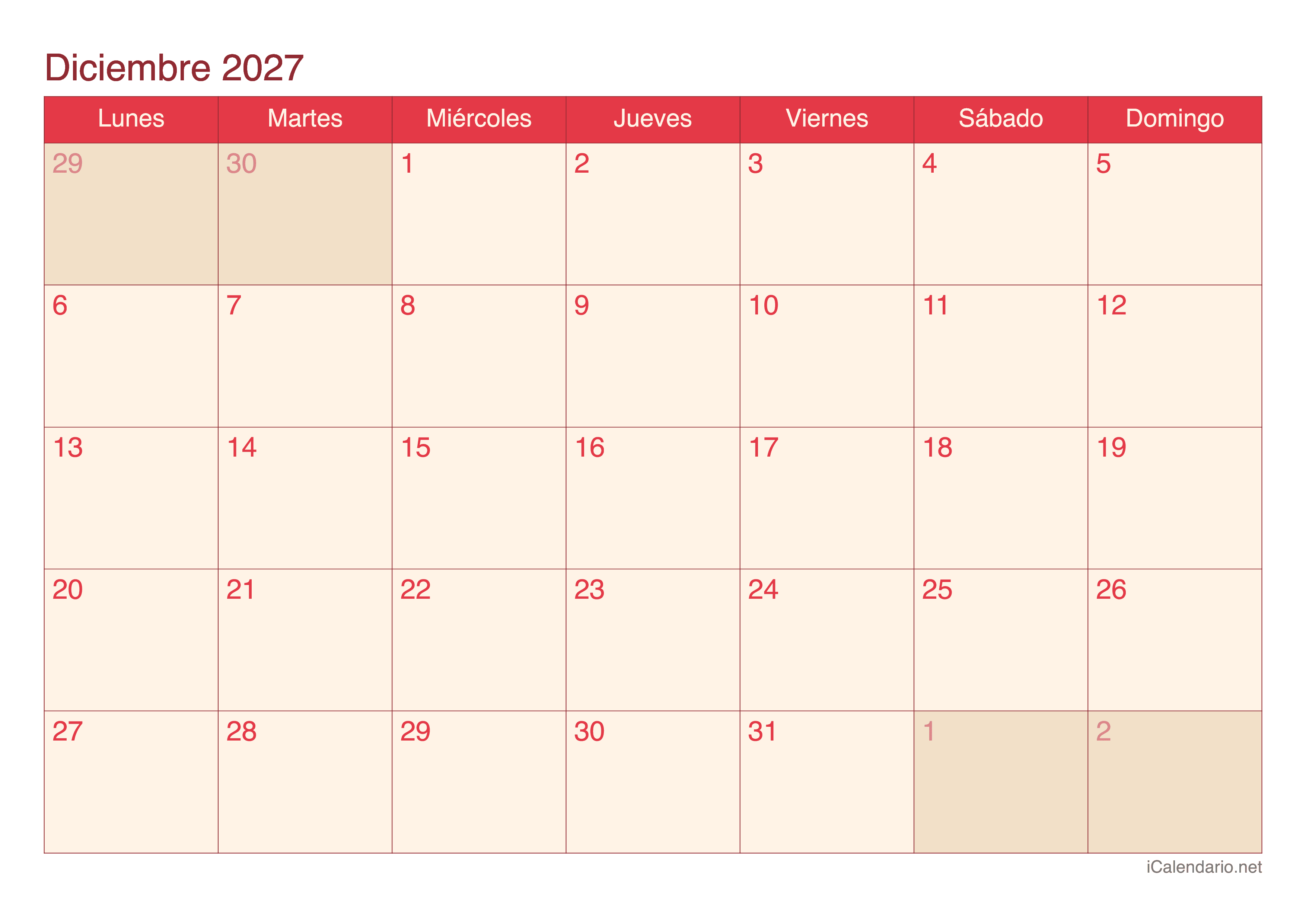Puedes descargar e imprimir gratuitamente el calendario en blanco de deciembre de 2027 en formato de imagen, PDF y Excel. También encontrarás otros ejemplos de calendario 2027 para el mes de diciembre.