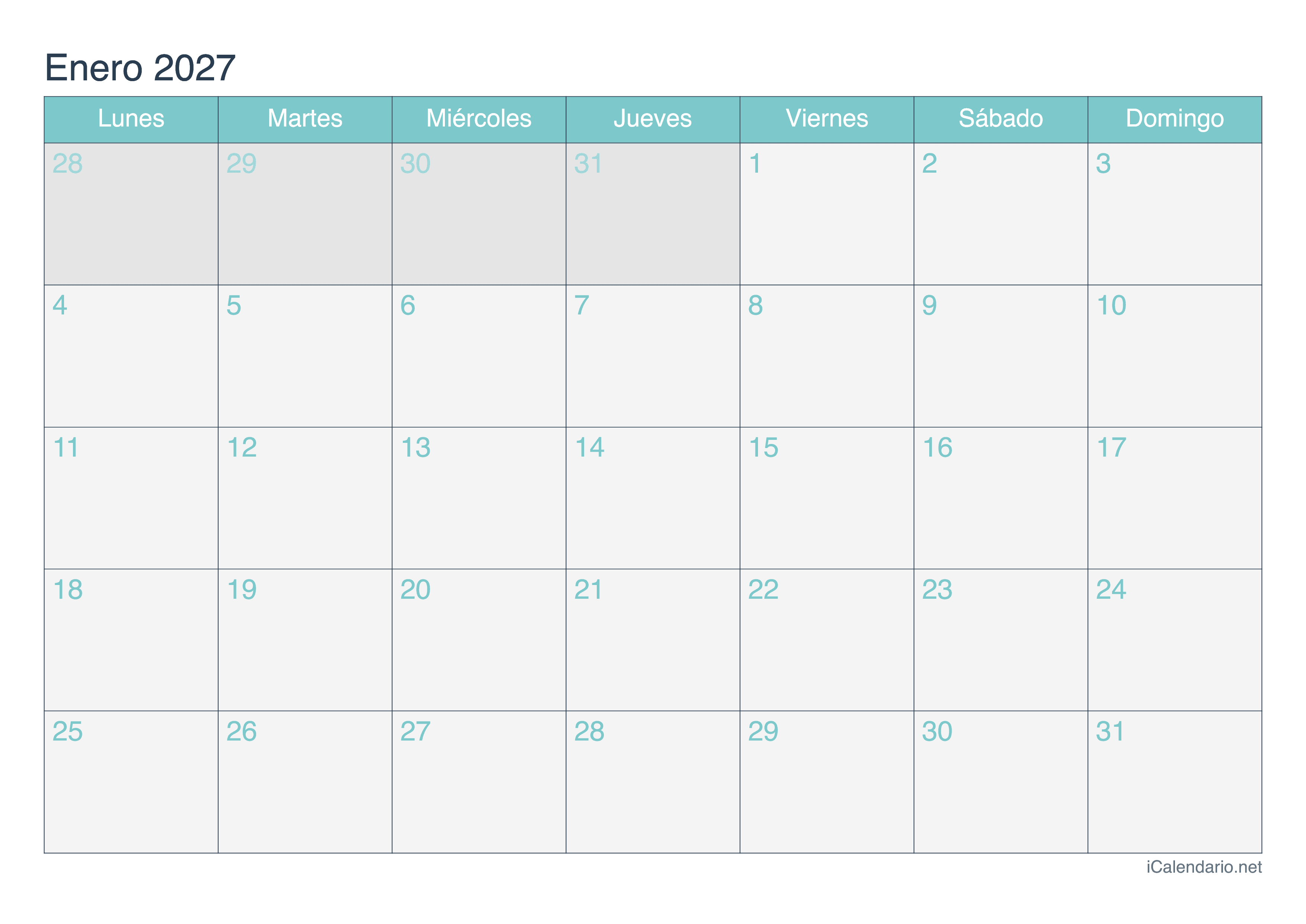 Calendario de enero 2027 para imprimir