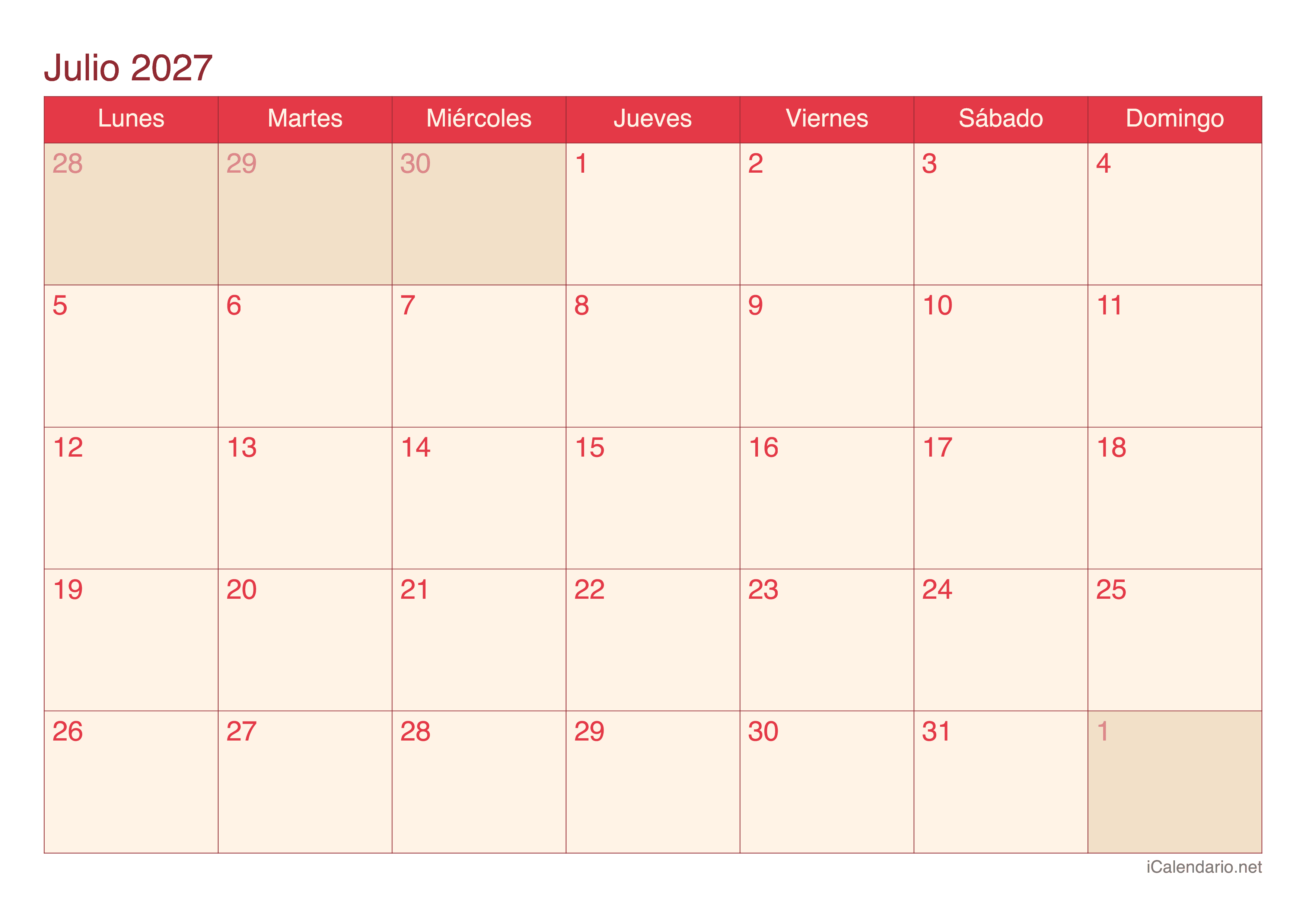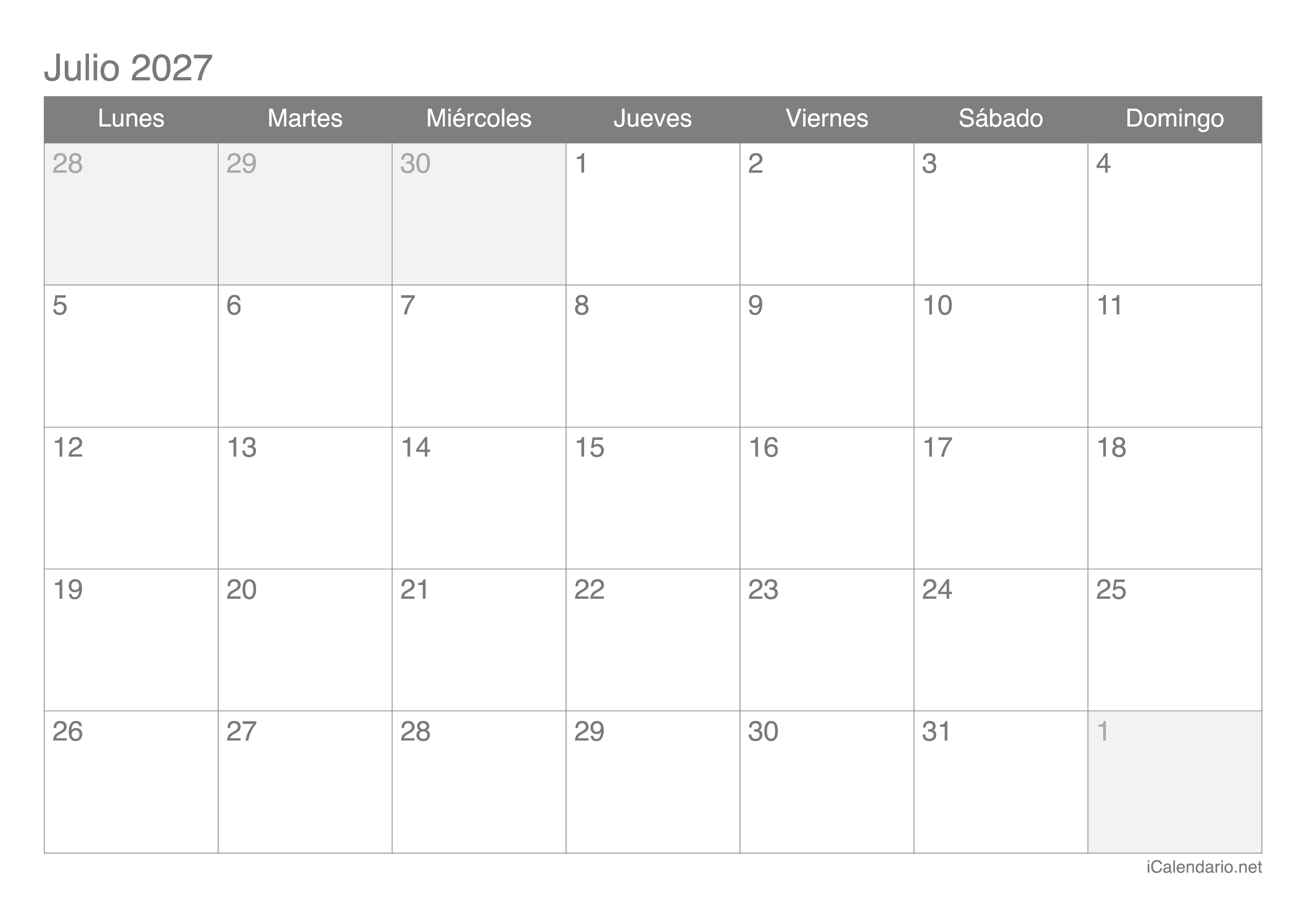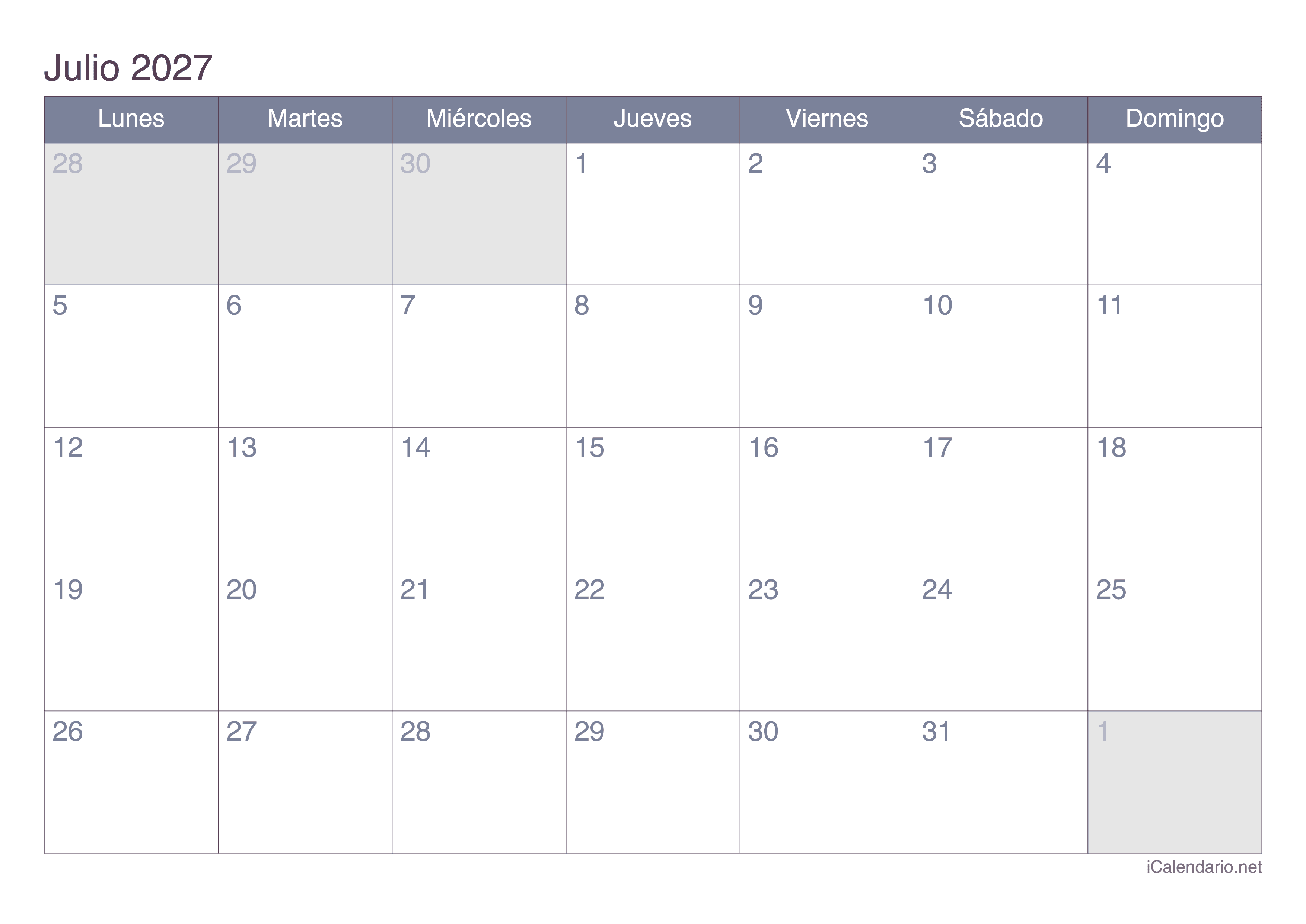 Puedes descargar e imprimir gratuitamente el calendario en blanco de julio de 2027 en formato de imagen, PDF y Excel. También encontrarás otros ejemplos de calendario 2027 para el mes de julio.