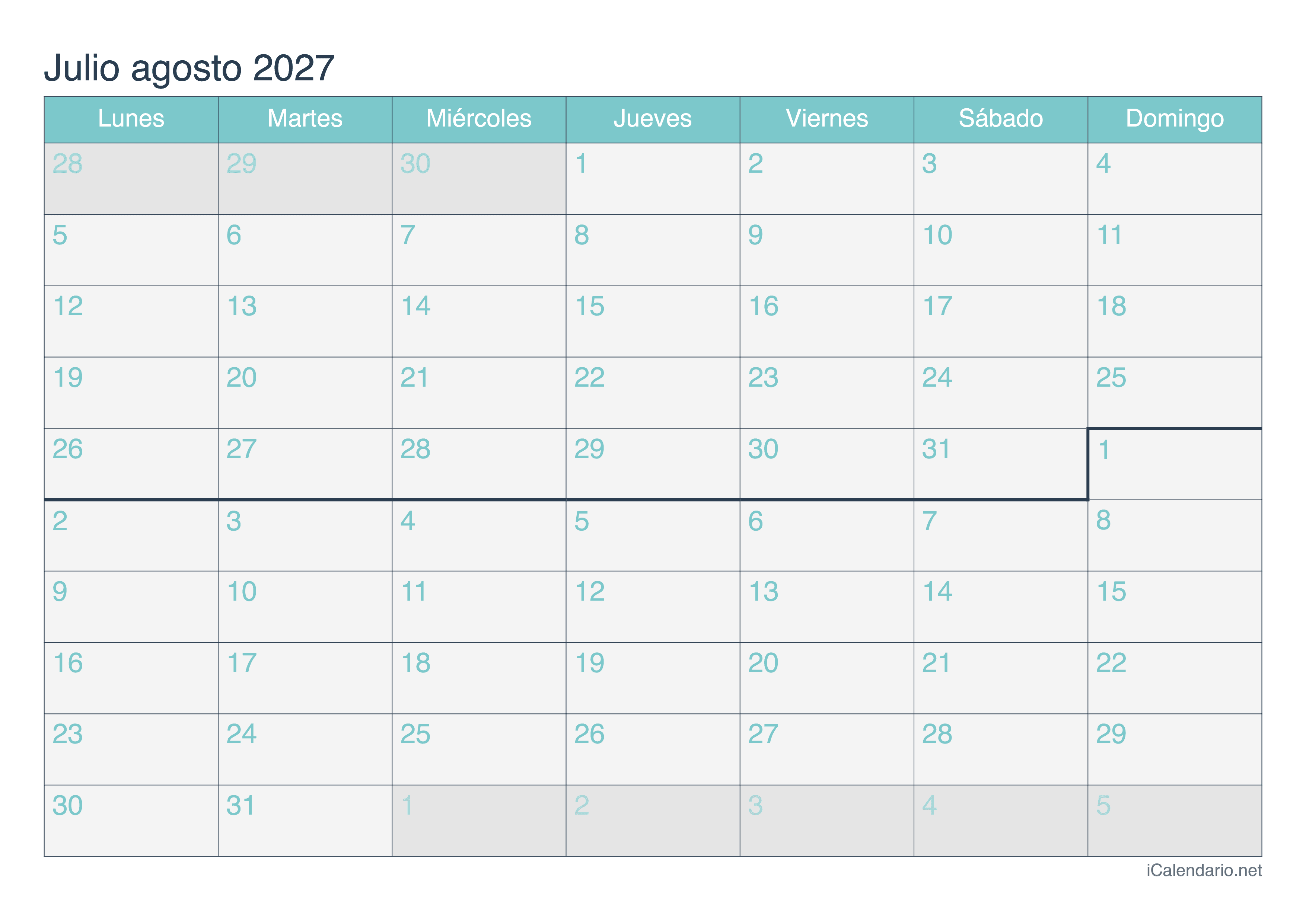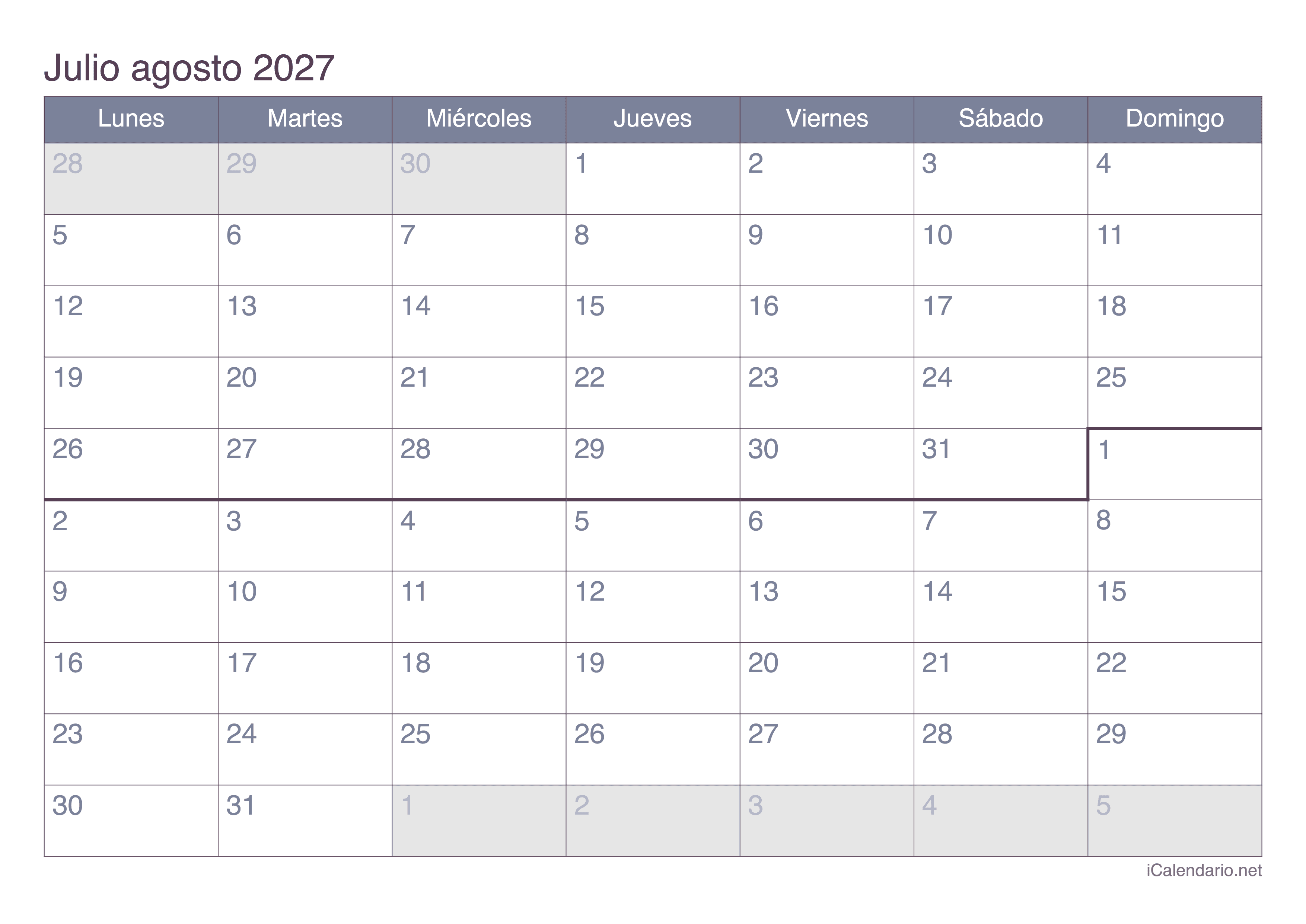 Puedes descargar e imprimir gratuitamente el calendario en blanco de julio y agosto de 2027 en formato de imagen, PDF y Excel. También encontrarás otros ejemplos de calendario 2027 para el mes de julio y agosto.