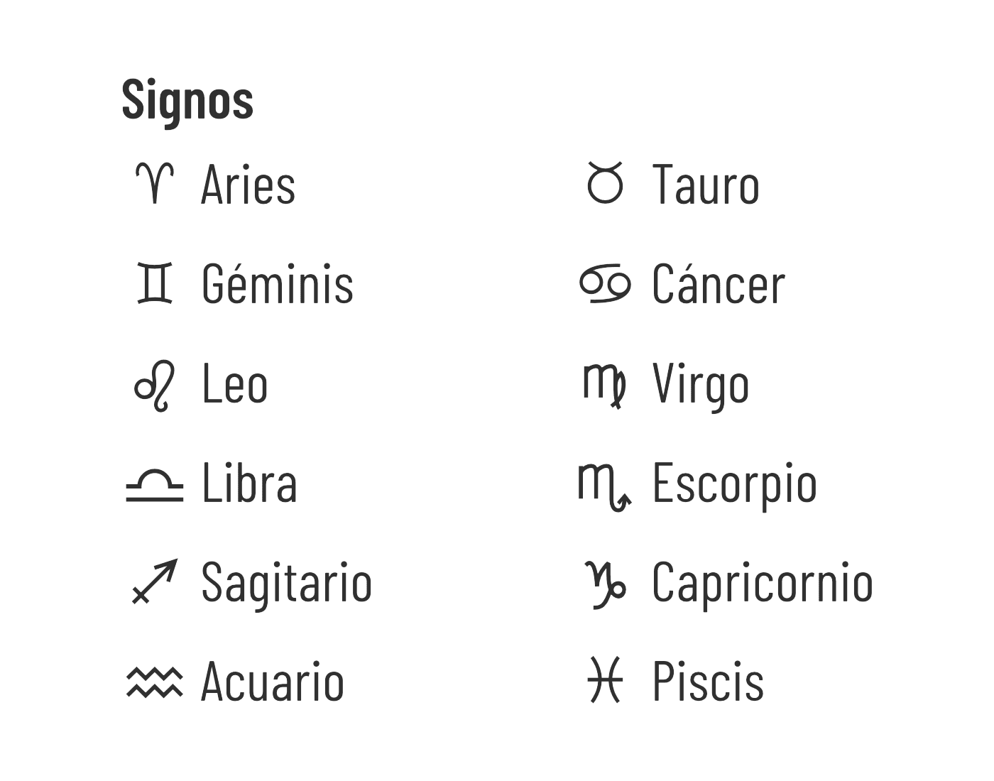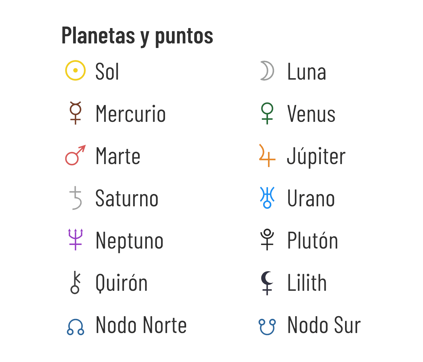 Para designar a los planetas y a los signos, los astrólogos utilizan los siguientes símbolos.