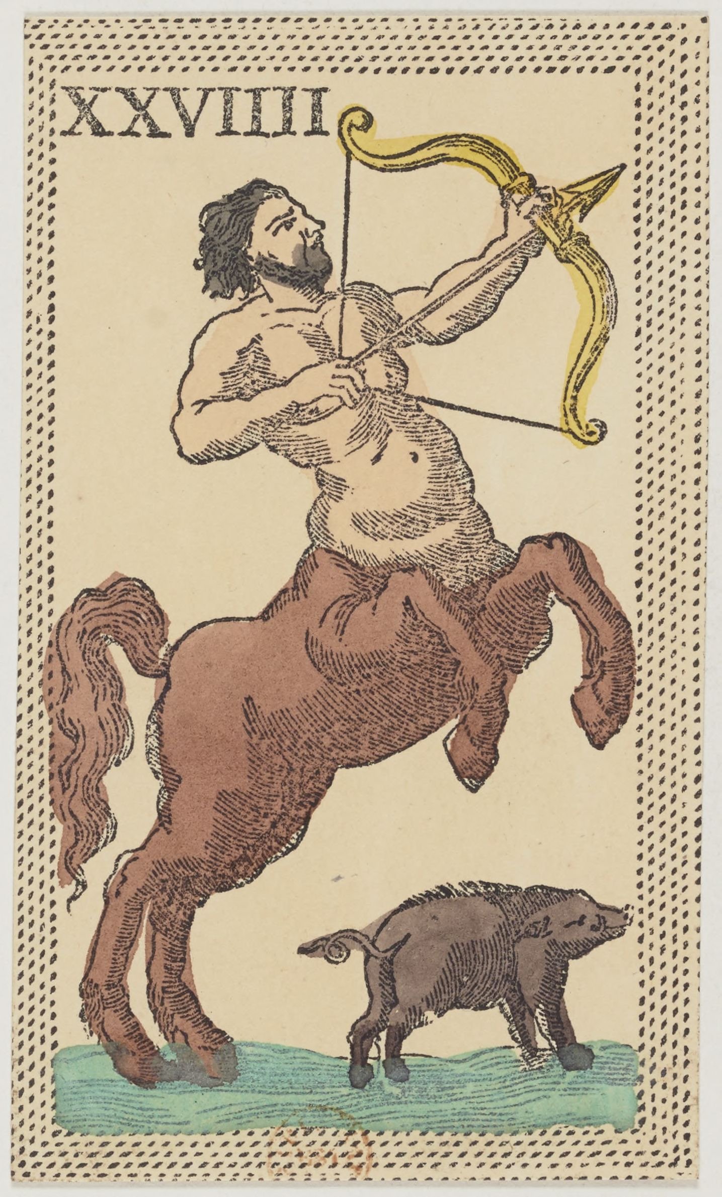 Sagitario está representado por un centauro, criatura mitad hombre, mitad caballo, armado con un arco cuya flecha apunta hacia el cielo.